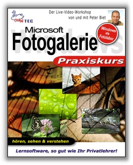 Windows 7/8/10 Fotogalerie Praxiskurs FSK: freigegeben ab 0 Jahren Alles, was Sie wissen müssen, um Ihre Fotos & Videos optimal zu verwalten und zu organisieren, Bilder perfekt zu bearbeiten und sie schließlich als Diashow oder auf Papier Ihren Freunden zu präsentieren, finden Sie in unserem Praxiskurs zur Windows Live-Fotogalerie, einer erstklassigen Freeware aus dem Hause Microsoft. In über 3 Stunden interaktivem Videotraining erläutert und erklärt ihnen unser Autor Peter Biet alles, was Sie wissen sollten. 65 Themen direkt zum Anklicken und zuschauen. Didaktisch sinnvoll geordnet und von der Länge wohl dosiert. Sprachoptimierter Schnitt in Kombination mit unterstützenden Animationen macht unsere neue Generation von Praxiskursen zu einem echten „Hingucker“ mit großem Lernpotential. Hören, sehen & verstehen im Jahre 2012… MEHR INFO € 19,95